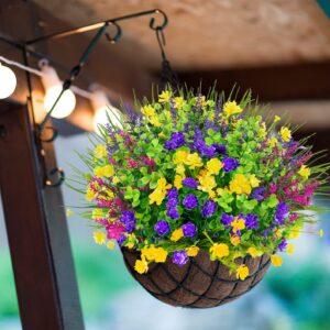 Colovis 9pcs Artificial Flowers Outdoor UV Resistant Fake Plants Greenery Shrubs Faux Plastic Flower in Bulk for Indoor Outside Hanging Planter Porch Cemetery Pots Decoration (Yellow, Purple, Green)